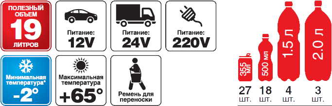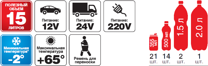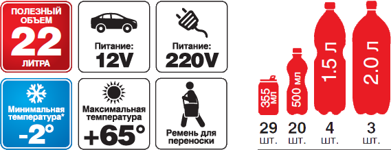 • Минимальная температура охлаждения: +5С (при температуре окружающей среды не выше +23*С и непрерывной работе не менее 3-х часов)