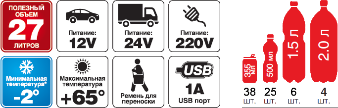 Автомобильный холодильник удобно использовать не только в автомобиле, а также и на даче, на природе! Помимо подключения к бортовой сети авто 12/24В, холодильник имеет разъем для подключения к 220 В бытовой сети. Удобный ремень для переноски, простота и удобство в эксплуатации. Удобная форма и легкий вес.